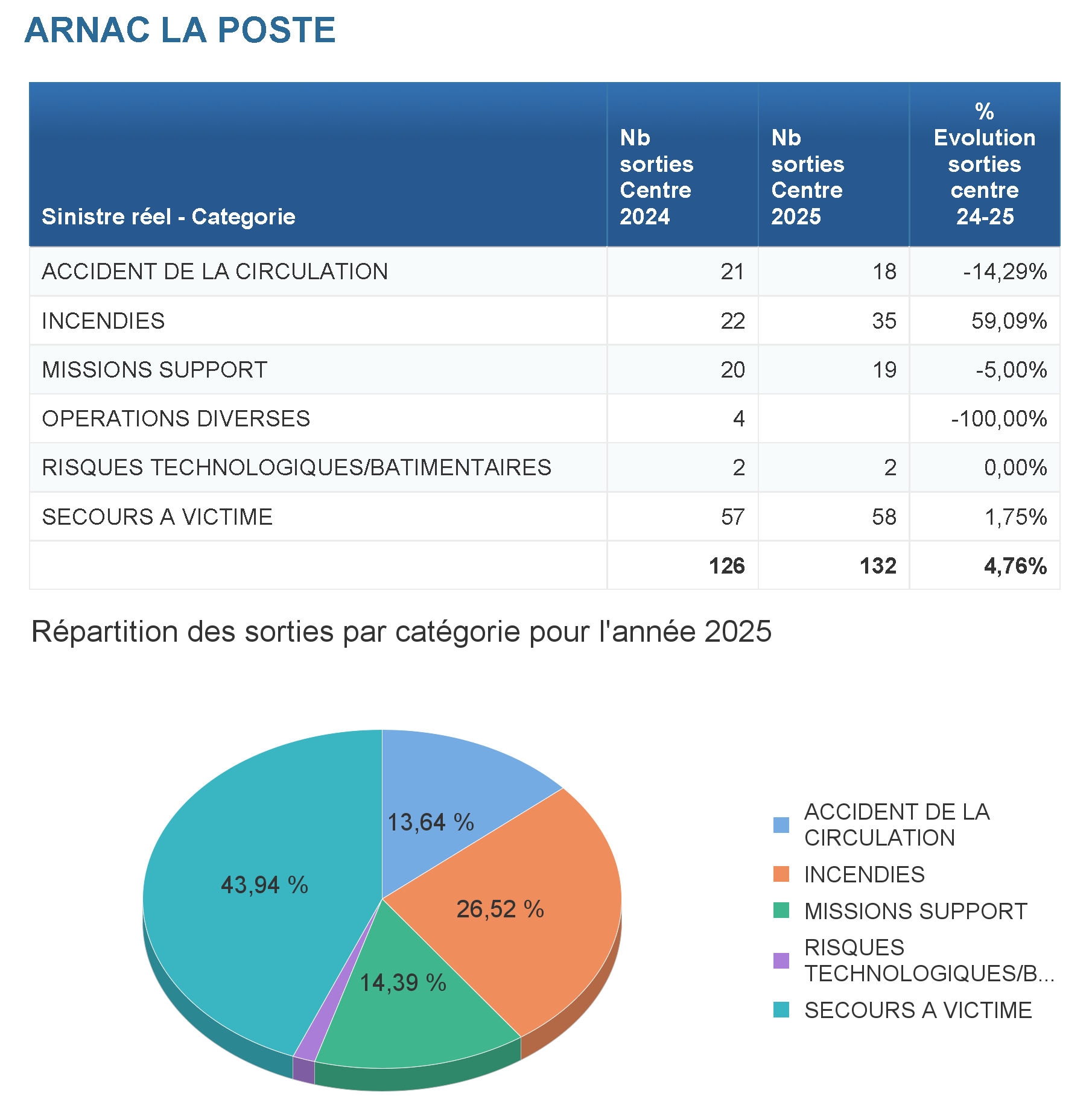 Le centre de secours a réalisé pour l'année 2024 : 126 sorties de secours sur son secteur et renfort des autres centres de secours.