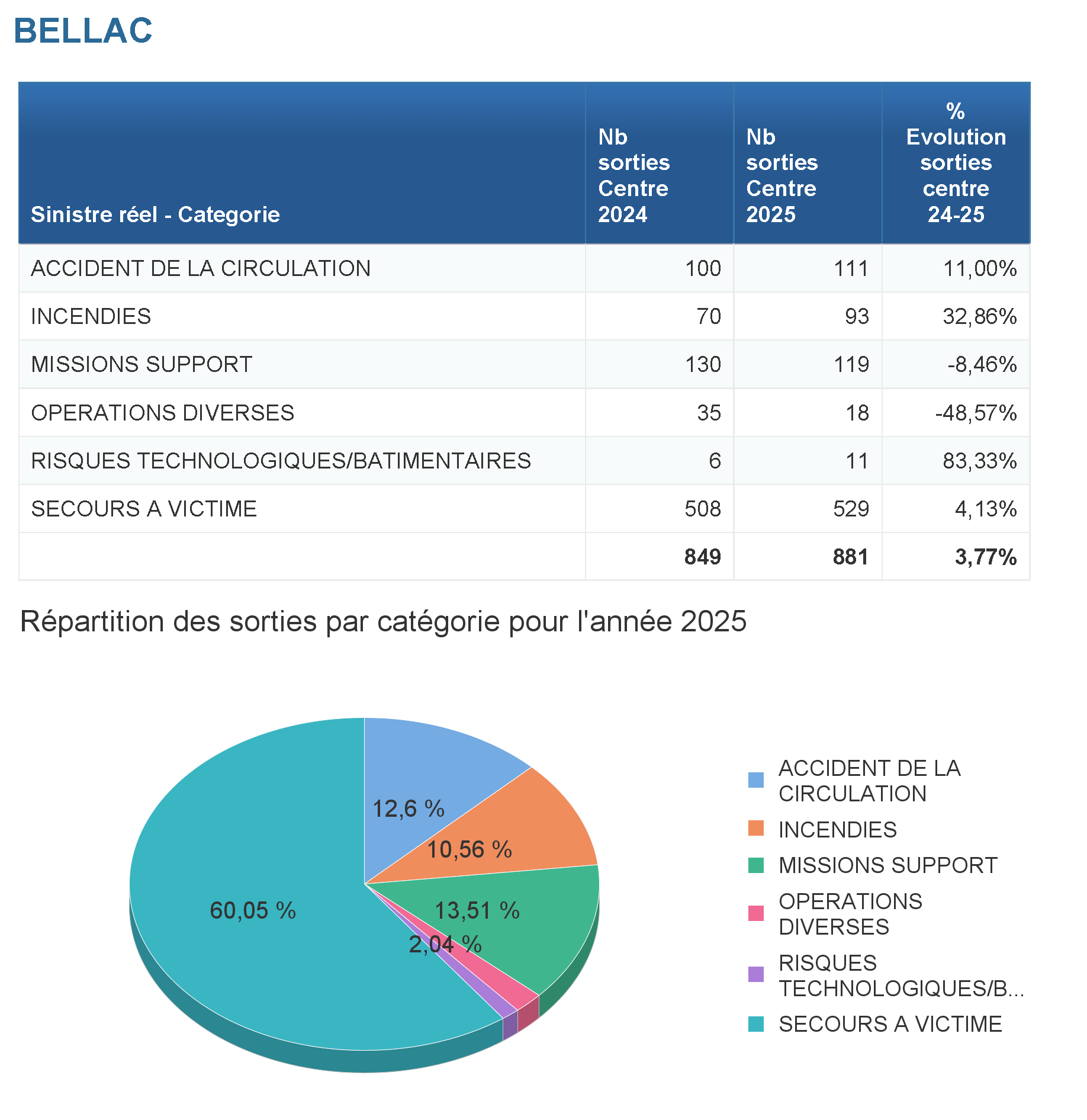 Le centre de secours a réalisé pour l'année 2025 : 881 sorties de secours sur son secteur et renforts des autres centres de secours.