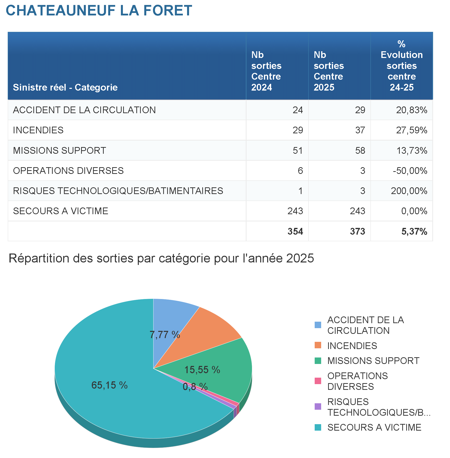 Le centre de secours a réalisé pour l'année 2024 : 351 sorties de secours sur son secteur et renforts des autres centres de secours.