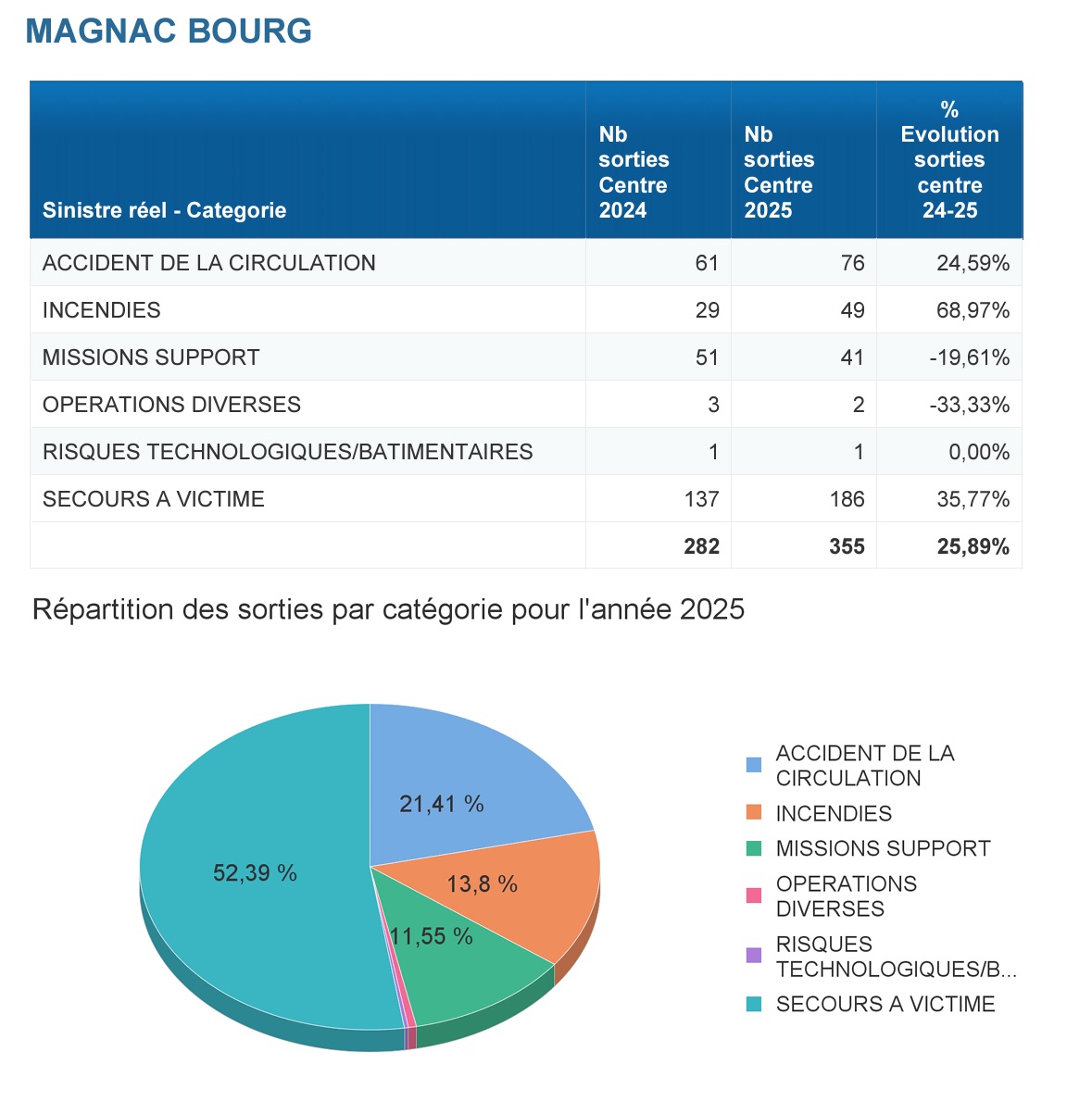 Le centre de secours a réalisé pour l'année 2025 : 355 sorties de secours sur son secteur et renfort des autres centres de secours.