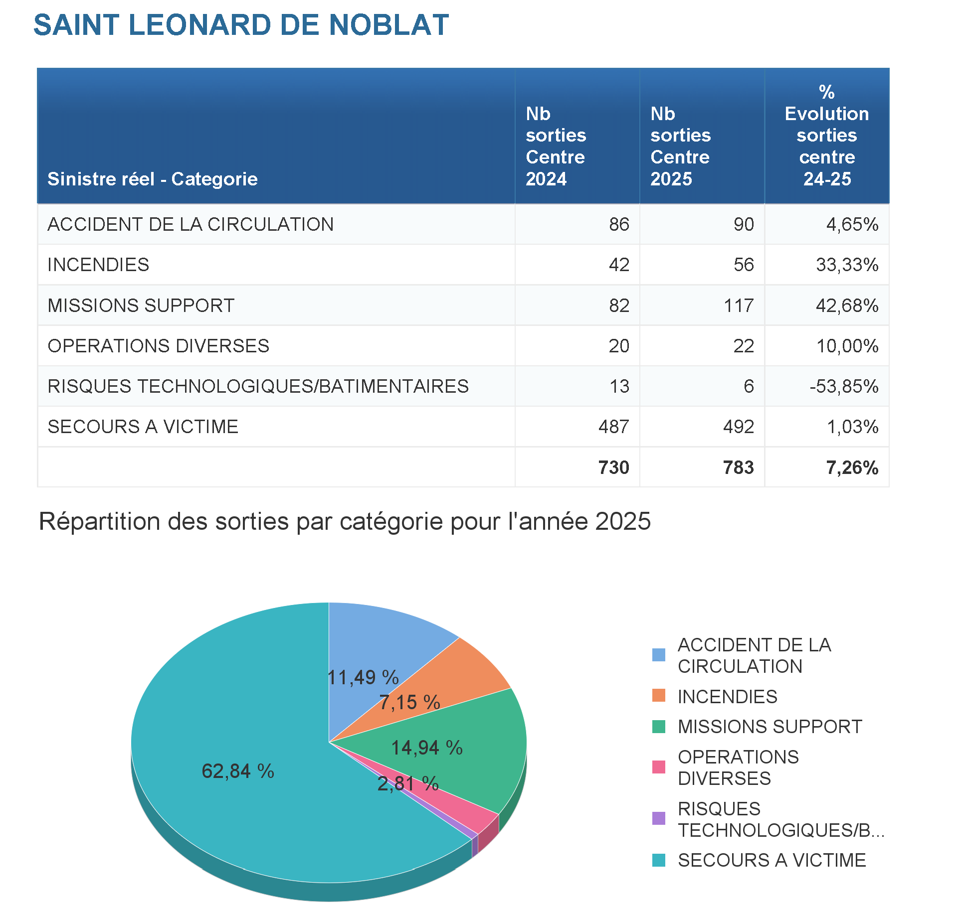 Le centre de secours a réalisé pour l'année 2024 : 730 sorties de secours sur son secteur et renfort des autres centres de secours.