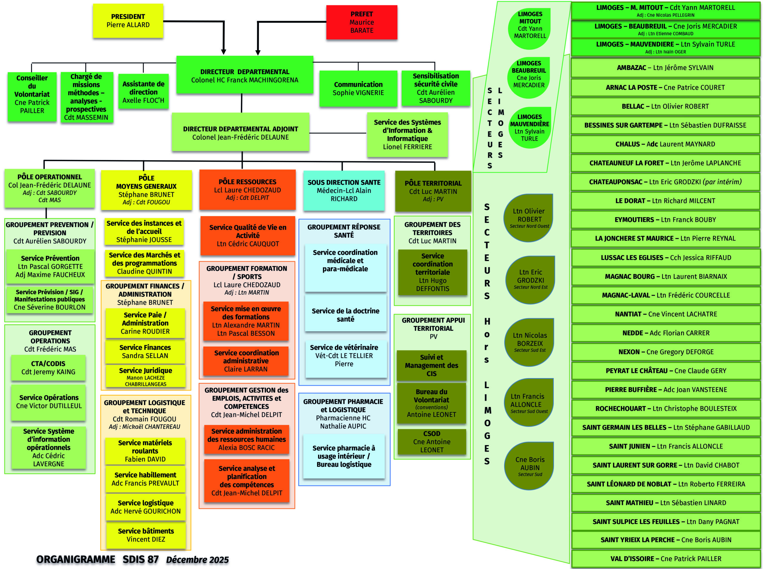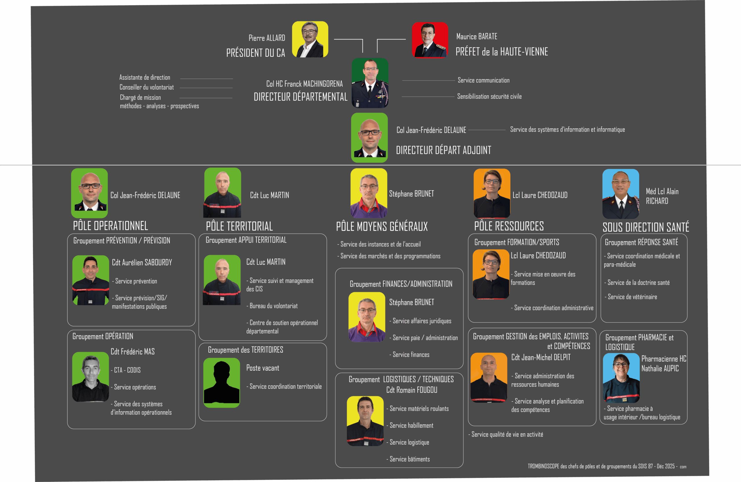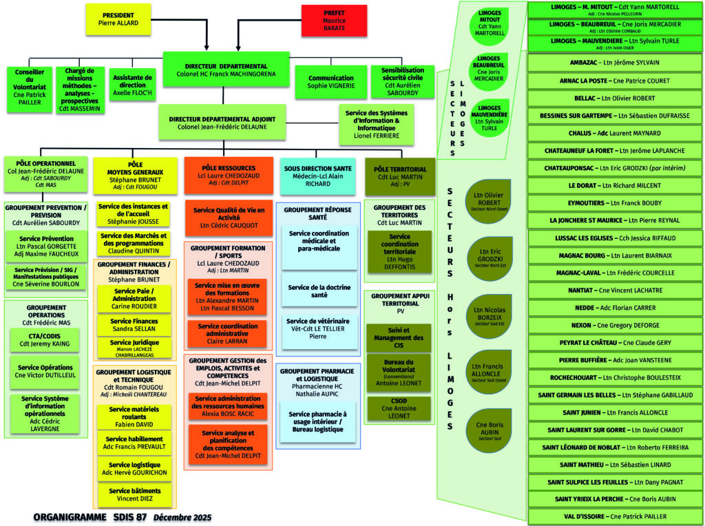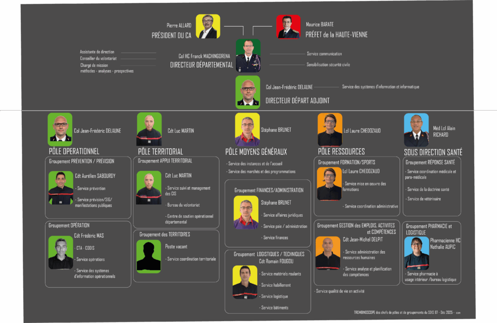 Pour le besoin de ses nombreuses missions , le SDIS 87 dispose d’un binôme de direction constitué du Directeur et du Directeur Adjoint, de 4 pôles fonctionnels et d’une sous direction santé :